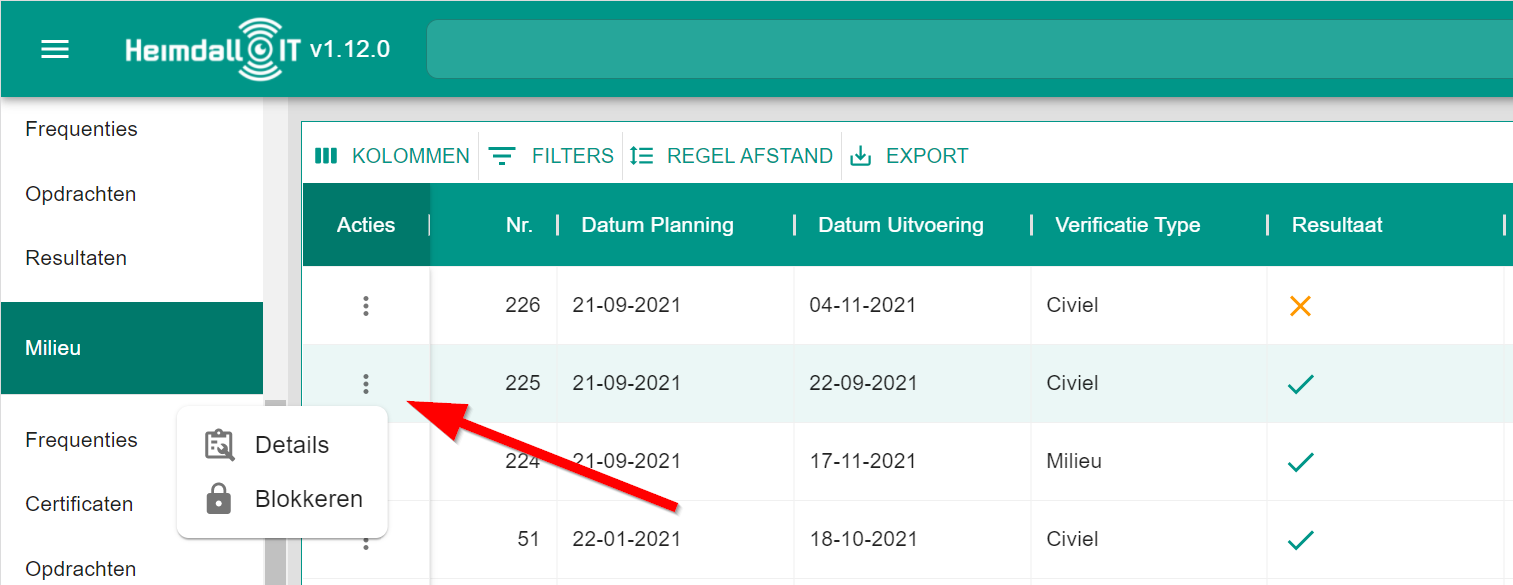 Links boven de datagrid staat het actie menu. Zie voorbeeld hieronder.